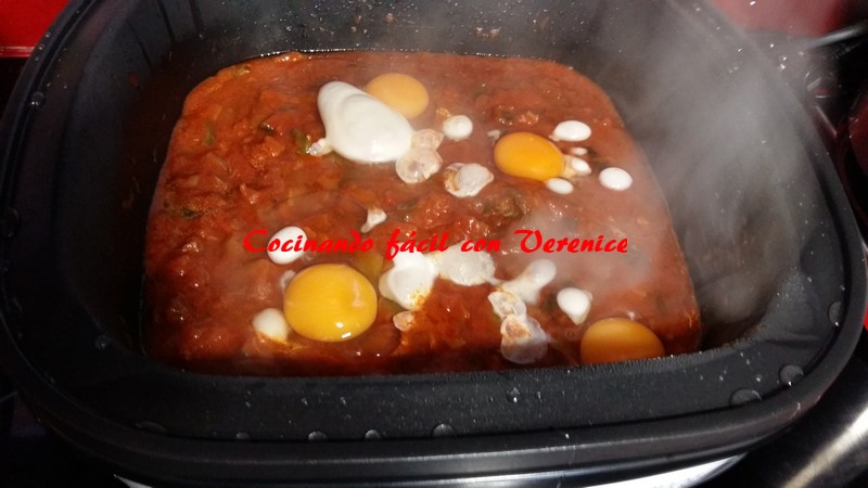 Se tapa de nuevo y se apaga el programa. Solo con el calor que desprende la olla con el pisto dentro, se cuajaron los huevos, la yema poco hecha y la clara totalmente cuajada, como nos gusta.