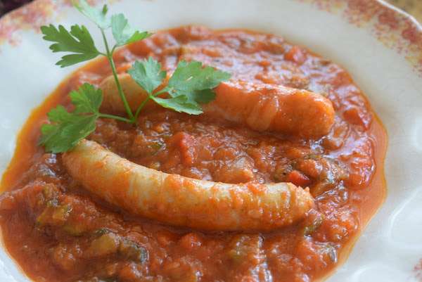Pon en el vaso la cebolla, pimientos y calabacín sin pelar, todo ello troceado. Programa velocidad 5, 4 segundos. Agrega el aceite, programa 20 minutos, temperatura 120º, velocidad cuchara, giro a la izquierda. Agrega el tomate, la cucharadita de pimentón, las salchichas, orégano, sal y pimienta al gusto. Programa 20 minutos, temperatura 120º, velocidad cuchara, giro a la izquierda.