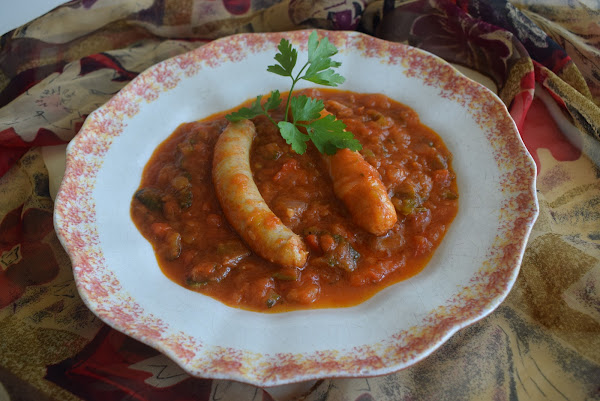 Hoy propongo pisto de calabacines con salchichas frescas de pollo, comeremos de lujo con ingredientes asequibles.