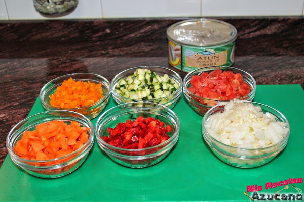 El tomate natural lo pelaremos y lo picaremos en cuadrados, reservamos.