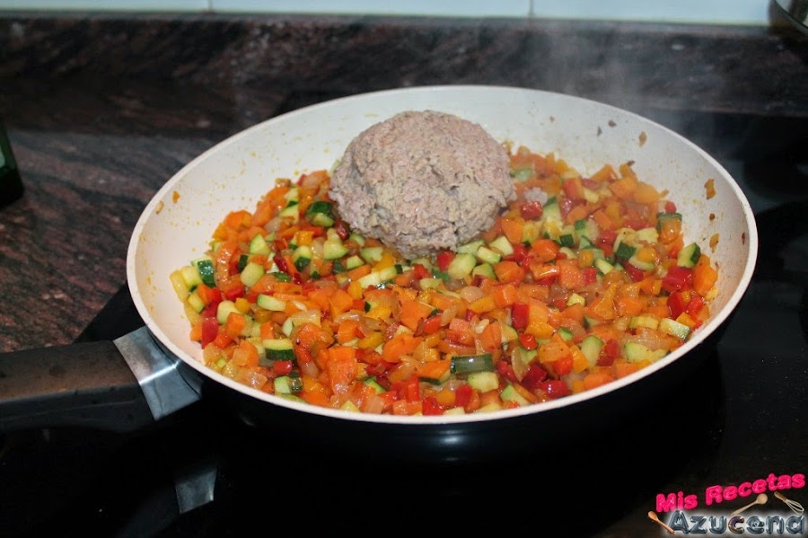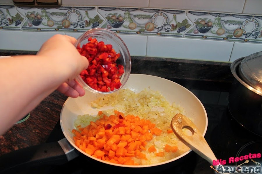 Estos los dejaremos sofreír durante unos 7 minutos hasta que la zanahoria empiece a estar tierna.