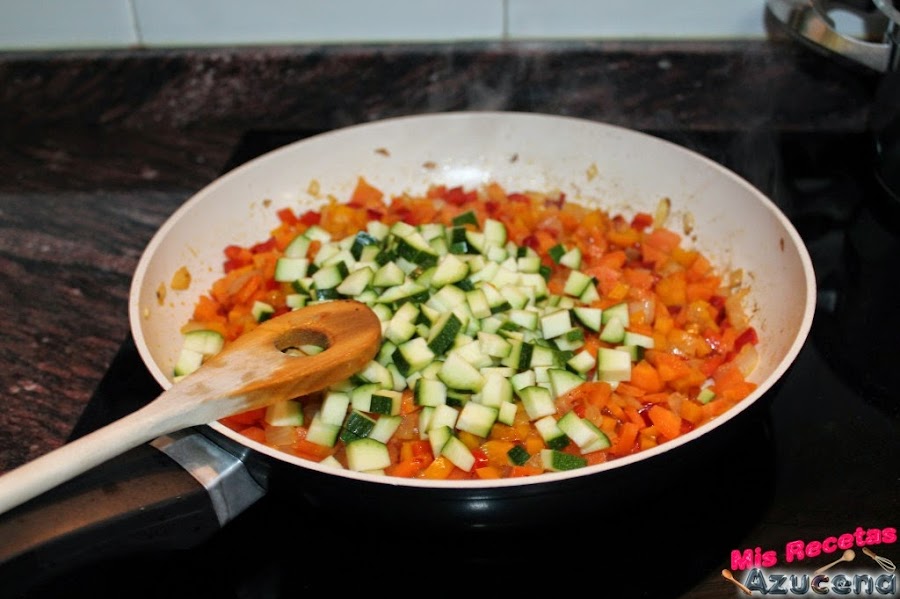 Pasado este tiempo añadiremos el calabacín, removemos todo y dejamos sofreír otros 5 minutos más.