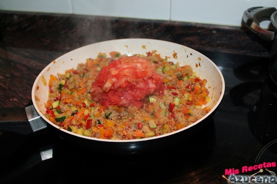 Una vez esté bien suelto el atún dejaremos sofreír 2 minutos y añadimos los dos tomates, removemos, comprobamos el punto de sal y tapamos la sartén, estos los dejaremos hasta que se pierda todo el agua que suelten los tomates.