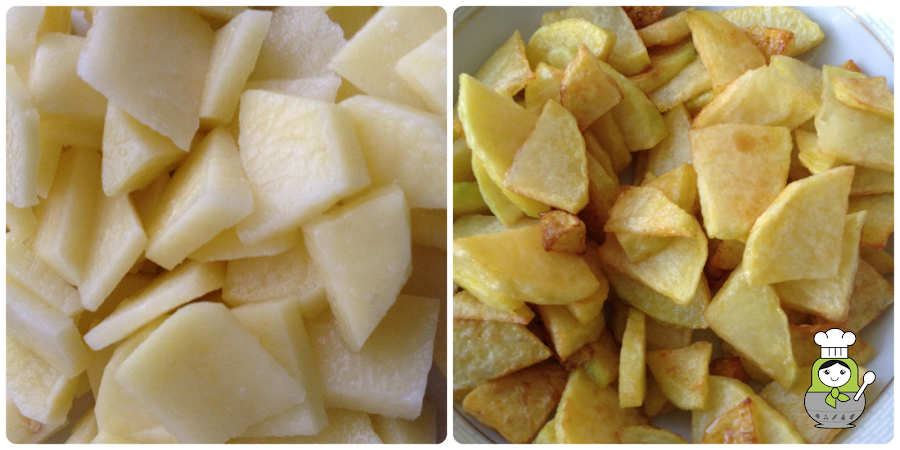 Ahora vamos a preparar las patatas. Las pelamos, cortamos en rodajas (o como para tortilla) y las freímos. Una vez fritas les escurrimos bien el aceite y las colocamos en un bol.