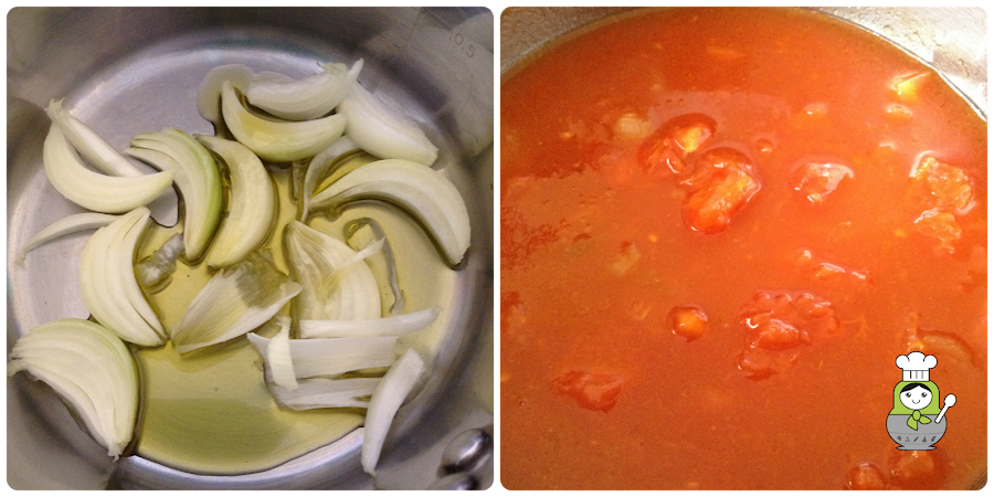 Mientras preparamos las judías aprovechamos para hacer la salsa de tomate. En un cazo, ponemos la cebolla cortada y la sofreímos en un poco de aceite de oliva. Cuando esté transparente, añadimos la lata de tomate triturado. Esperamos a que levante hervor, bajamos el fuego y dejamos que se haga durante una media hora (vigilando que no se seque, si es así, añadimos un poco de agua).