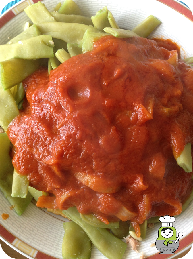 Una vez cocidas, escurrimos y añadimos las judías a las patatas y por último, la salsa de tomate con el atún.