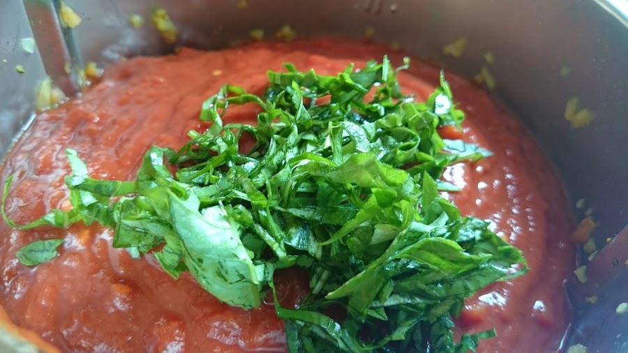 Luego le quitamos las mariposa e incorporamos la salsa de tomate que habíamos reservado con un chorrito de aceite de ajo, las hojas de albahaca cortadas, sal y pimienta.