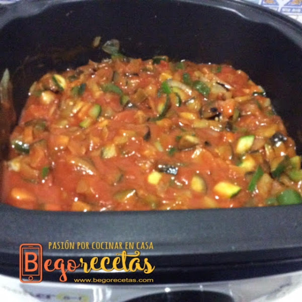 Cuando tengamos la verdura blandita añadimos el tomate frito, colocamos la tapa y cocinamos durante 10 minutos en función slow cook.