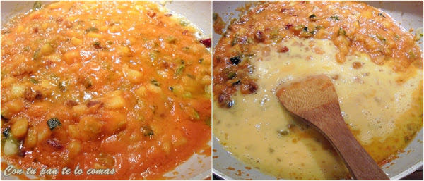 4. Añadimos el tomate frito (el mío es casero) y removemos bien. Enseguida batimos los huevos y a fuego muy suave los cuajamos con el pisto.