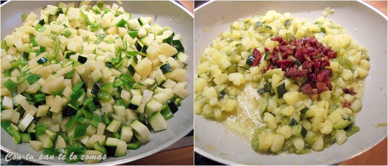 2. En la misma sartén freímos la patata, calabacín y pimientos verdes todo cortado en daditos pequeños y se sazona con un poco de sal. Se va haciendo poco a poco, dando vueltas a toda la verdura y si hiciera falta más aceite para que no se pegue a la sartén, se le añade.