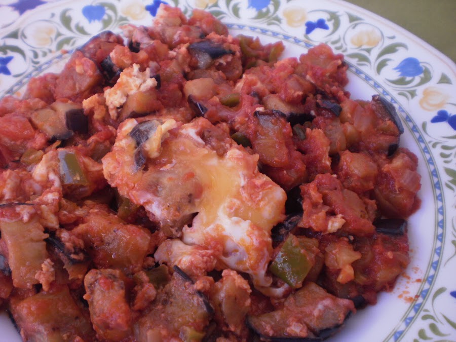 En la misma sartén pochar la berenjena, cuando se vea blandita, añadir nuevamente la fritada de cebolla, pimiento y ajo y el tomate, pochándolo siempre a fuego lento durante unos minutos, salándolo al gusto.