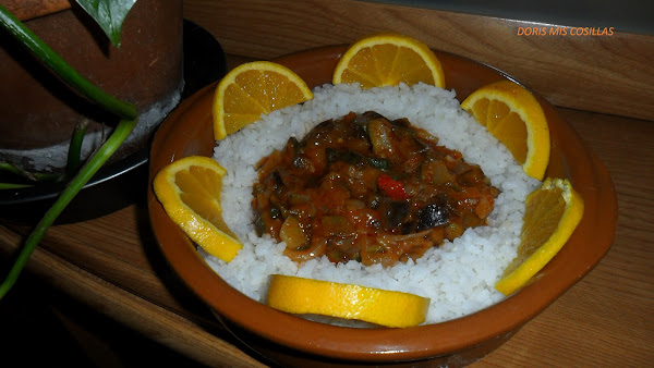 Cocemos el arroz como guarnición, yo lo cocí como es costumbre en agua salada 20 minutos, aclaramos con agua fría y bien escurrido.Para servirlo, podemos saltearlo o ponerlo tal cual y no añadimos mas grasa, queda mas ligero el plato.