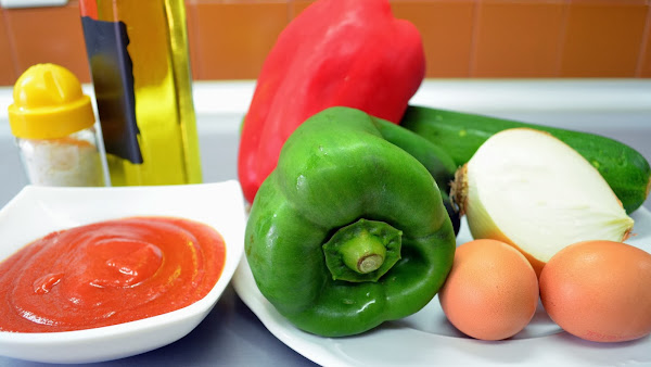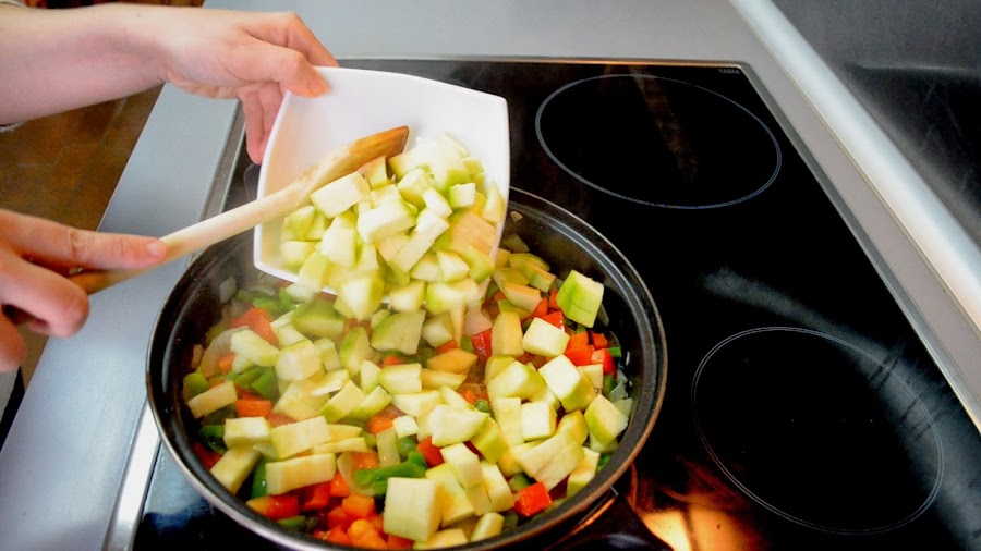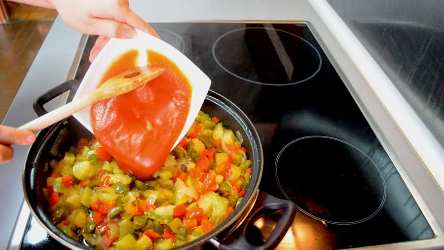 Receta de cocina de cómo preparar un pisto manchego tradicional español de verduras, acompañado de unos huevos fritos paso a paso: