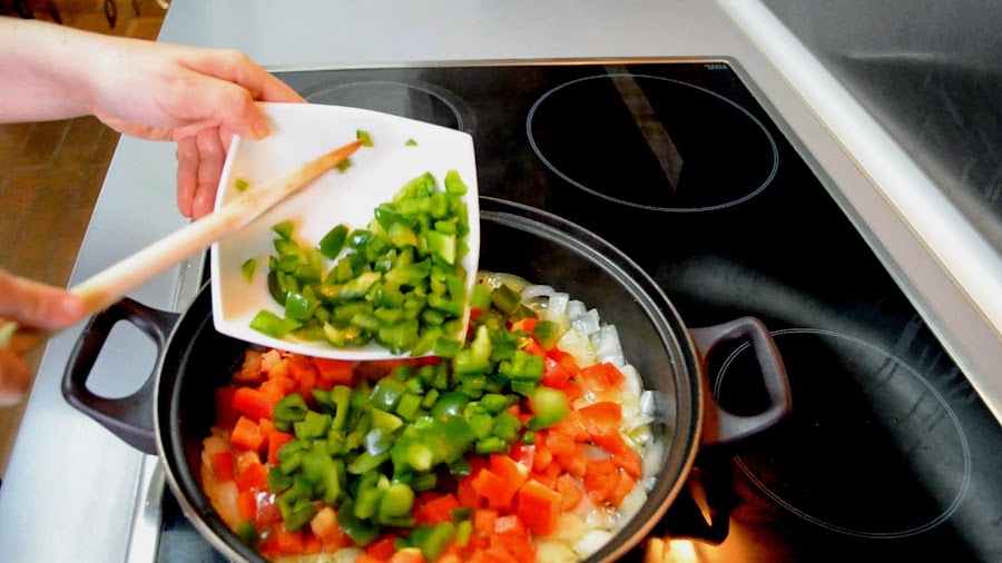 Sofríe la cebolla en aceite de oliva y cuando esté trasparente añade los pimientos troceados.