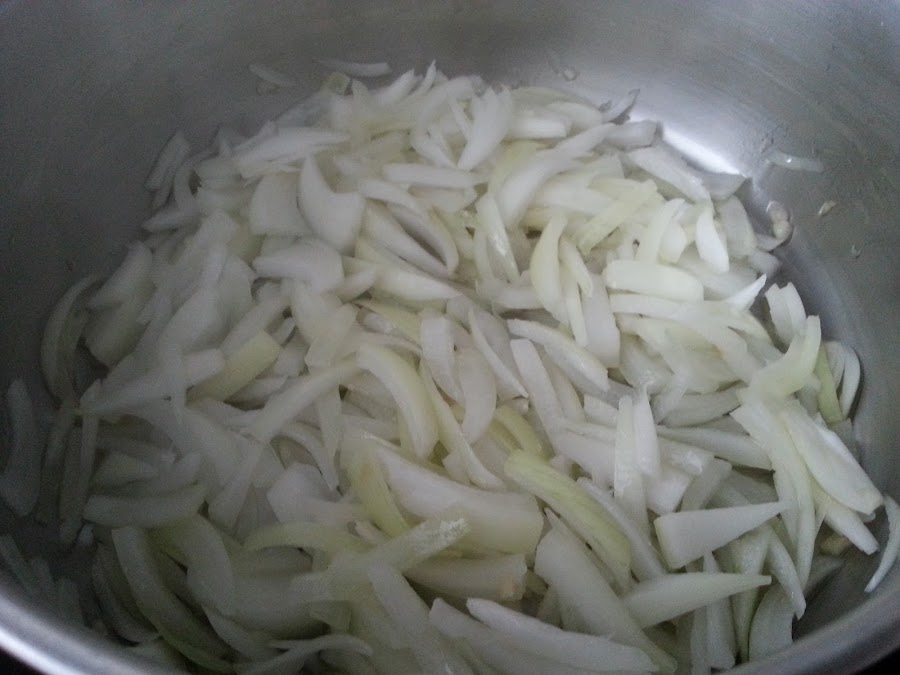 3. - Ponemos en una cacerola bastante grande el aceite, y vamos friendo el ajo, cuando esté empezando a dorarse, le añadimos la cebolla, y dejamos que vaya haciéndose.