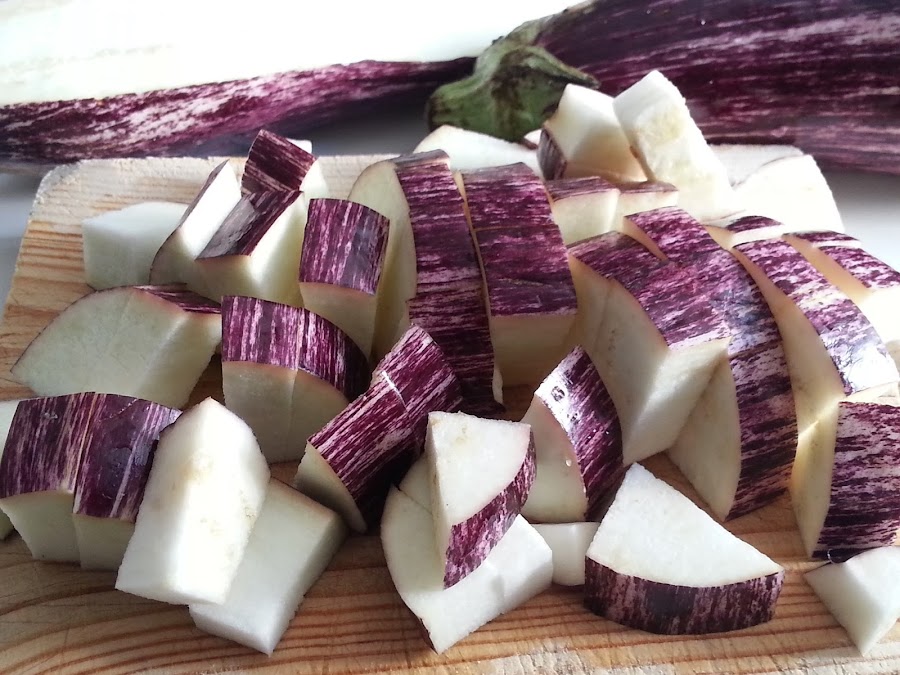1. - Lo primero que haremos será cortar la berenjena en dados y las salamos, dejándolas en un escurridor, para que suelten el amargor.