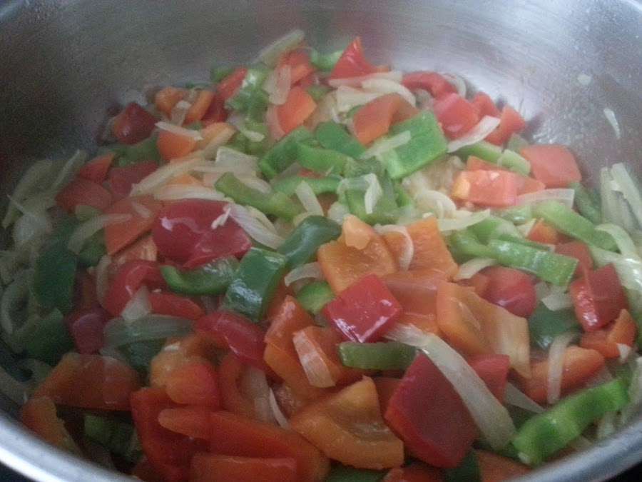 5. - Cuando la cebolla esté pochada, ya transparente, le añadimos los pimientos, y dejamos 5 minutos.