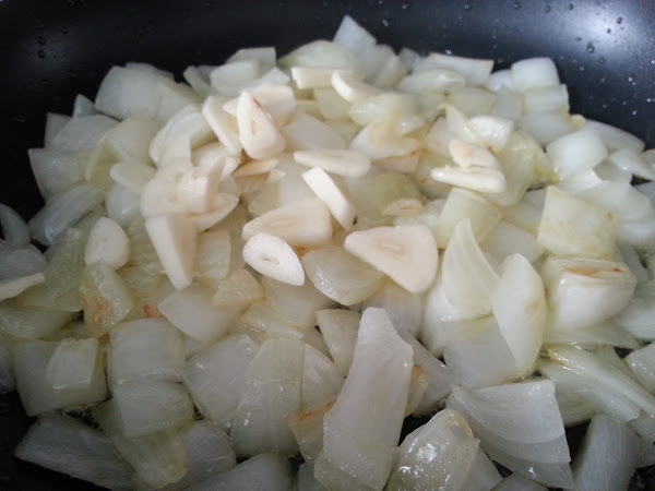 4. - Pelamos los ajos, los cortamos en láminas y los añadimos a la cebolla.