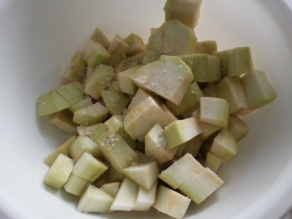 1. - Lo primero que haremos será pelar la berenjena y trocearla en dados, ni demasiado grandes, ni demasiado pequeños. La ponemos en un bol con un poco de sal por encima, para que suelte el amargor.