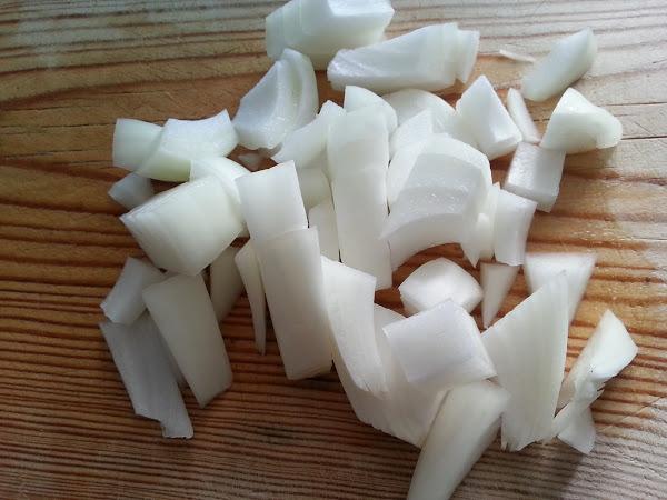 3. - Troceamos la cebolla, también en trozos medianos, y la ponemos a pochar.