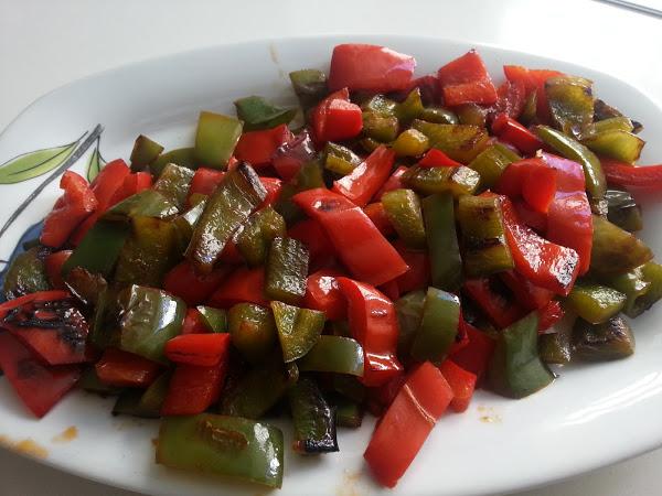 6. - Troceamos los pimientos y los ponemos en una sartén con un poco de aceite a fuego fuerte, para que se doren un poco y reservamos.