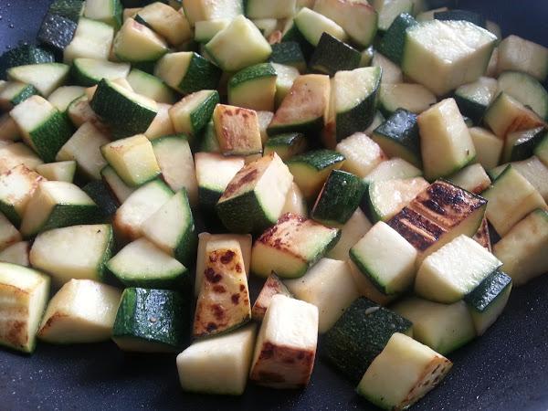 8. - Repetimos lo mismo con los calabacines. Cuando estén doraditos, le agregamos las verduras anteriores, los pimientos, y la berenjena, y dejamos a fuego medio, que sigan cociéndose.