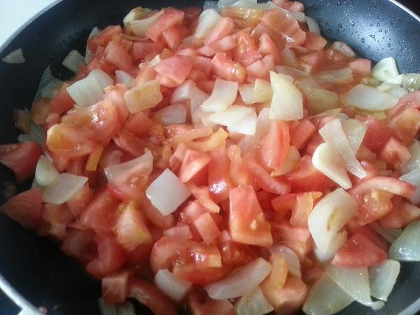 9. - Una vez la cebolla está bien pochada, le añadimos los tomates y dejamos cocer unos 15 minutos, en ese momento le añadimos una cucharada de azúcar y sal, y dejamos cocer un poco más.