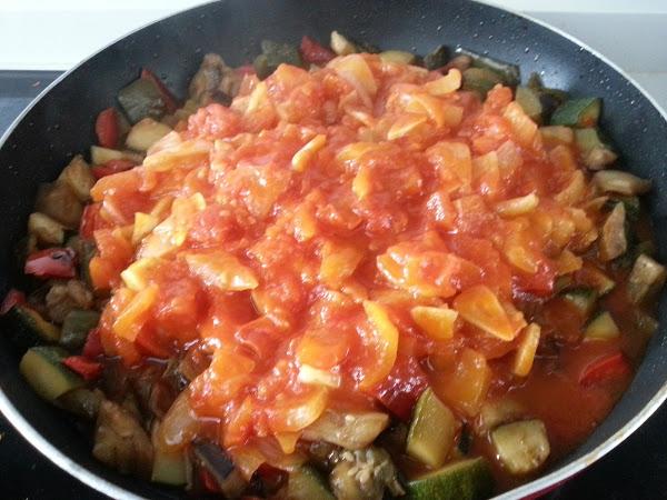 10. - Y por último, echamos la fritada de tomate sobre las verduras y dejamos cocer hasta que esté a nuestro gusto.
