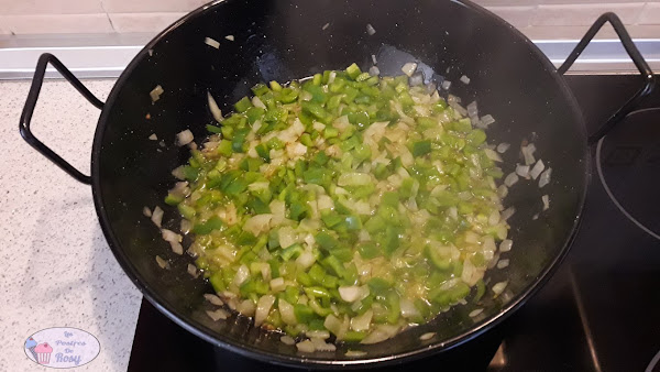 - Añadimos el pimiento verde y sofreímos unos minutos(3-4).