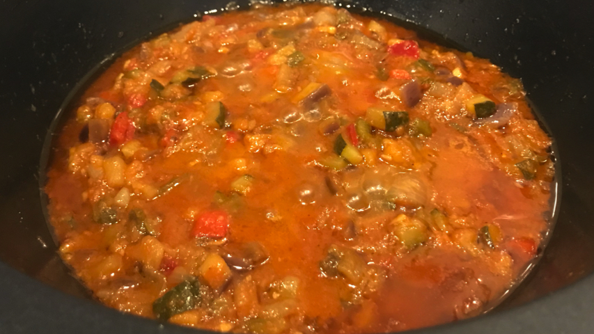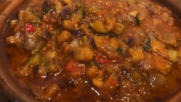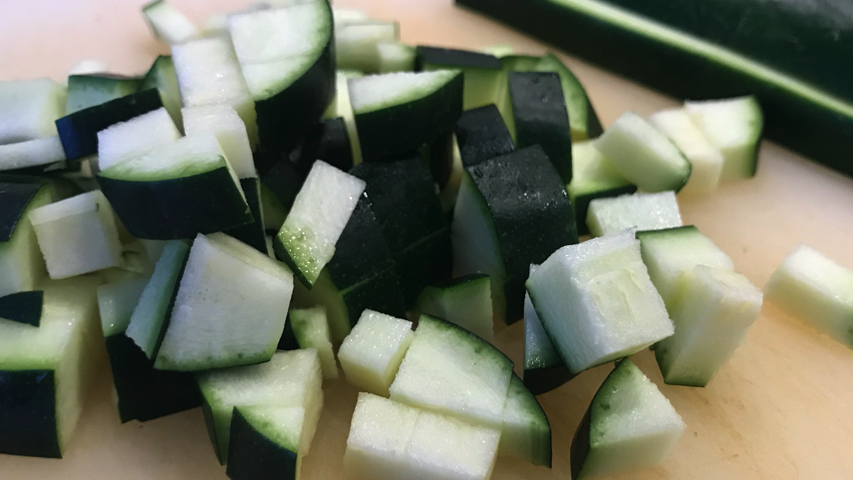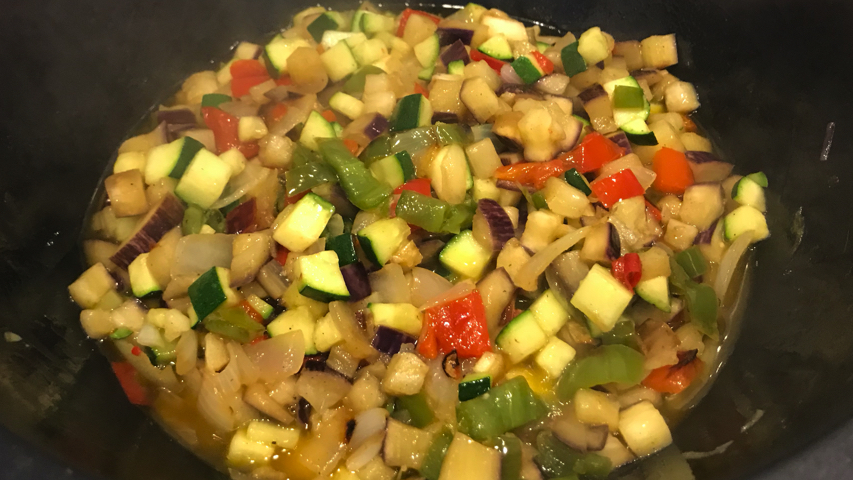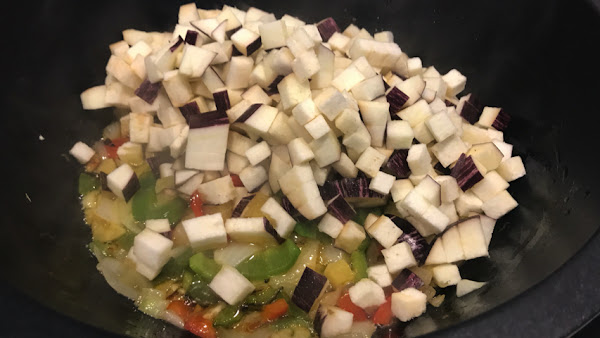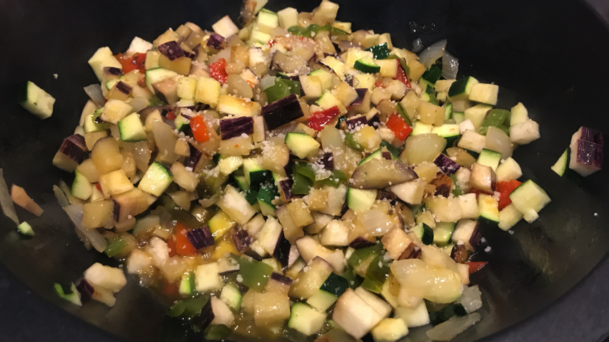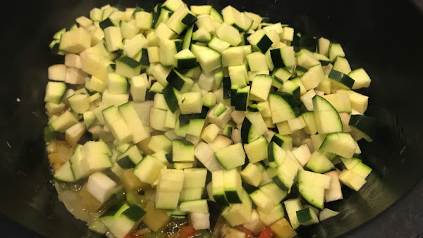 Incorpora la berenjena y el calabacín. Sazona. Mezcla todo bien. Deja que sofrían.