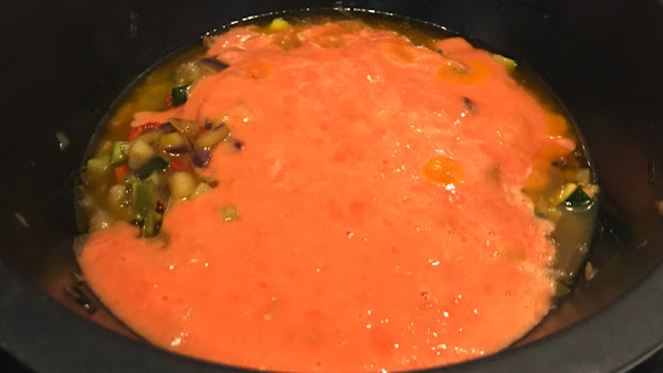 Añade el tomate rallado. Mezcla, baja el fuego y deja cocinar al menos 30 minutos.