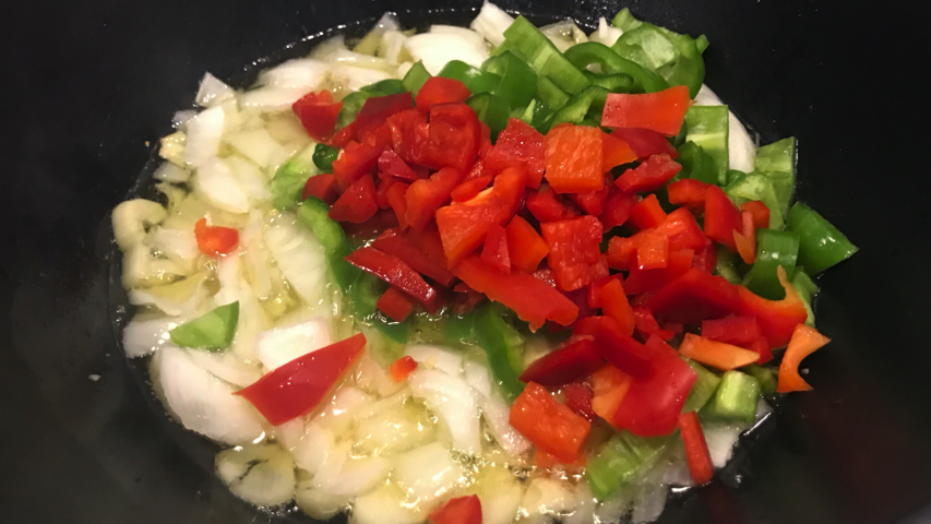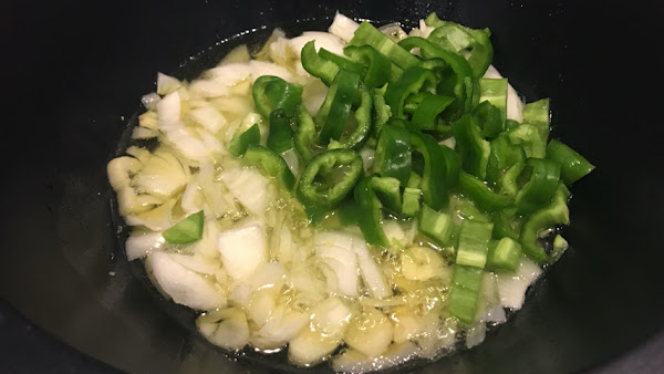 Sofríe el ajo, la cebolla y los pimientos verde y rojo con un puntito de sal.