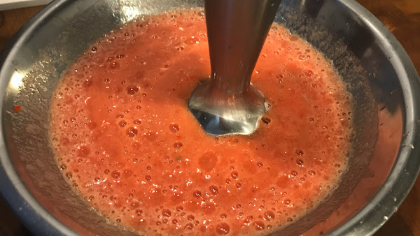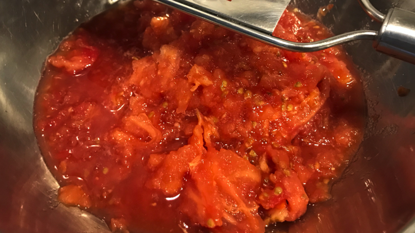Ralla el tomate para eliminar las pieles. Tritura la pulpa de los tomates.