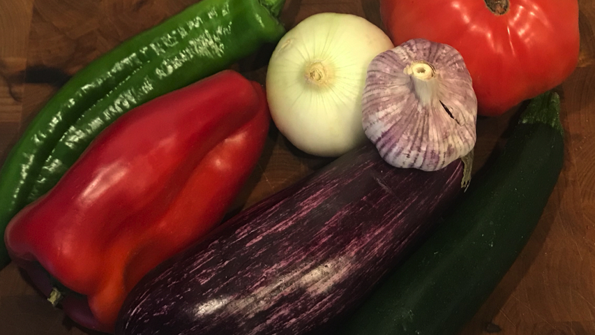 Corta menudo el ajo, la cebolla, el pimiento verde, el pimiento rojo, la berenjena y el calabacín.