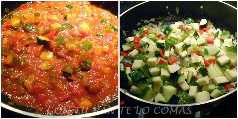 3. Una vez que los pimientos están hechos, añadimos el calabacín, sazonamos bien todas las verduras y dejamos que se hagan tranquilamente. Yo prefiero no poner sal hasta ahora porque es más fácil que se te vaya la mano con la sal si vamos poniéndole cada vez que añadimos las verduras.