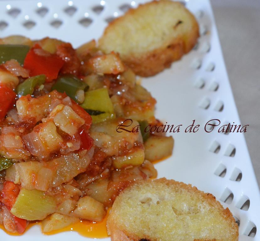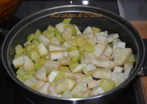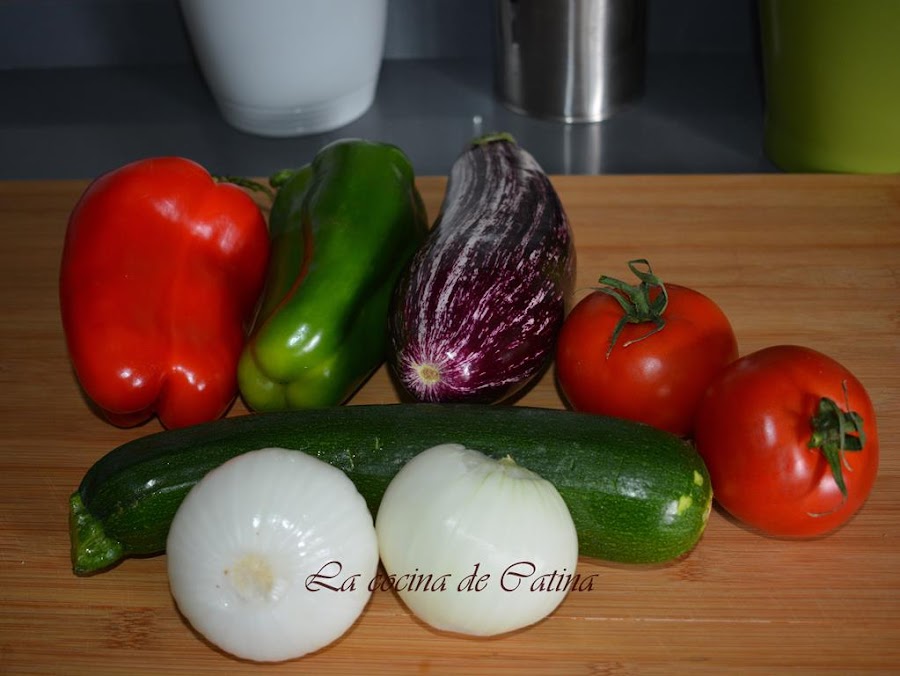 En el mismo aceite freímos el calabacín y la berenjena, cuando veamos que está frito sacamos y reservamos junto a los pimientos y cebolla.