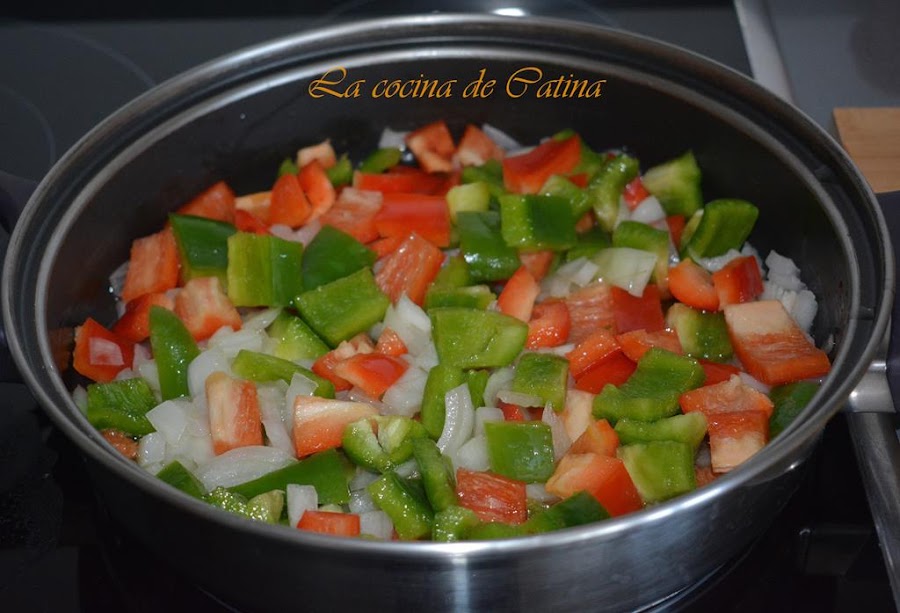 Ponemos a calentar una sartén con el aceite y empezamos friendo las cebollas y los pimientos cortados en dados, rehogamos durante 10 minutos y reservamos.