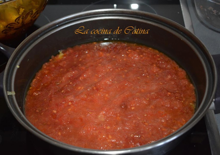 Por último freímos el tomate salpimentado y con la cucharadita de azúcar a fuego lento, durante 15 minutos.