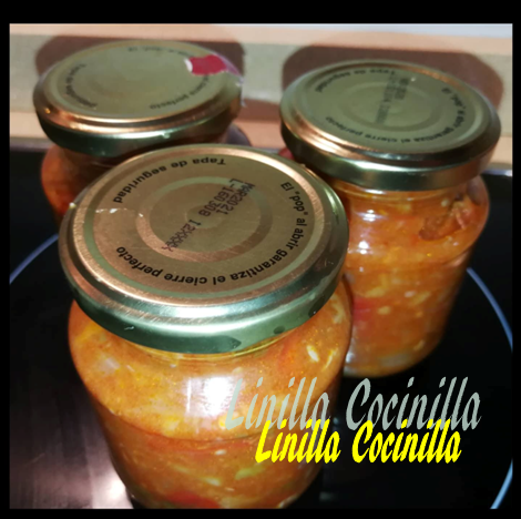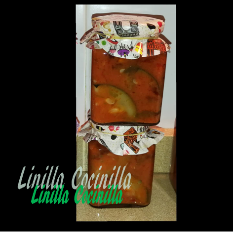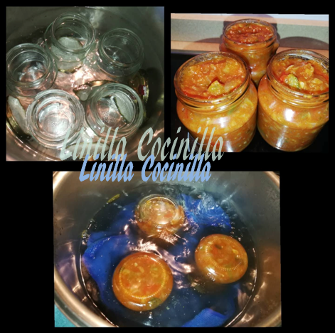 6. Ponga los botes de cristal con sus tapas en una olla que los cubra y dejar que hiervan unos 25 minutos, sacarlos de la olla y dejarlos reposar. Rellenarlos con el pisto preparado con anterioridad, sin dejar burbujas en los botes. Tapamos bien y fuerte. Mientras calentamos agua en una olla y en el fondo ponemos un trapo, cuando empiece a hervir introducimos los botes boca abajo y que los cubra, unos 35 minutos. Se dejan reposar en la misma olla. Una vez los saquemos se limpian bien y se revisa que las tapas se hallan quedado con el botón para adentro. Cuando estén fríos etiquetamos y guardamos en lugar fresco y seco.