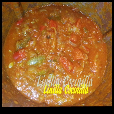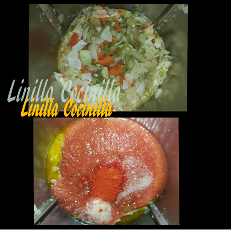 4. Incorpore el tomate triturado, la sal, la pimienta y el pimentón dulce. Programe 20 min/120ºC/giro inverso/vel cuchara.