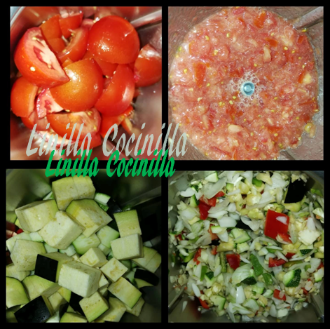 2. Ponga en el vaso la cebolla, el pimiento rojo, el pimiento verde, el calabacín y la berenjena. Trocee 5 seg/vel 4. Sí prefiere las verduras más troceadas y uniformes retire el cubilete e introduzca la espátula por el bocal y mientras va triturando la mueve con la mano. Así se consigue que todo quede del mismo tamaño.