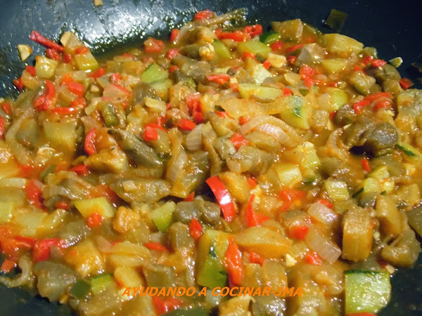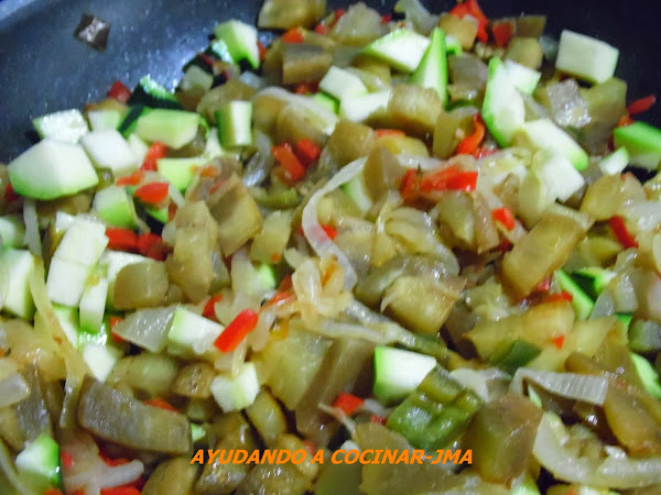 Los ingredientes para elaborar este plato son hortalizas variadas (cebolla, pimiento, tomate.... ) es por ello que en muchas zonas se le llama fritada. No obstante, admite múltiples variantes. En este caso he incorporado berenjena y calabacín. Así mismo, dado que es un plato dificilmente aceptado por los más pequeños, en casa habitualmente le agregamos patata, de manera que nos facilita mucho la labor y les ayuda a acostumbrarse poco a poco a las texturas de estos ingredientes que son tan necesarios en su dieta.