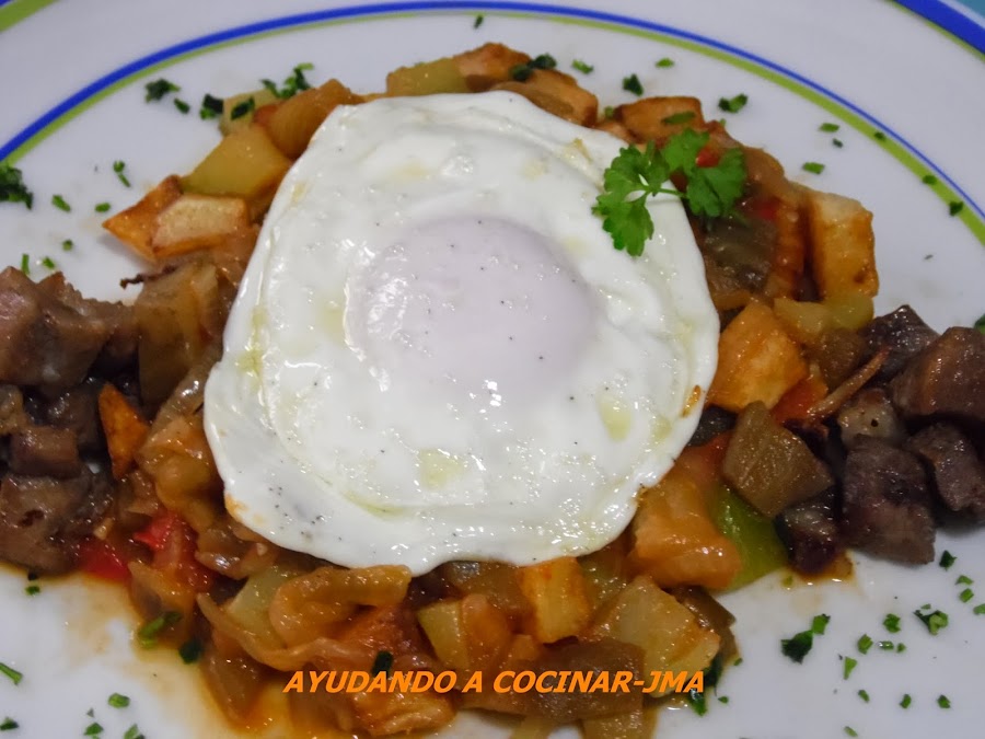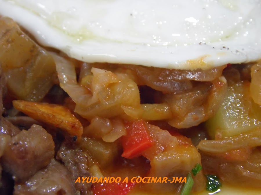 En cuanto a la sugerencia de presentación, he optado por añadir un huevo frito y unos taquitos de carne de cerdo..... con esto hemos convertido un humilde pisto, en un plato único y muy completo nutricionalmente hablando.... proteína de la carne y el huevo, hidratos de la patata, vitaminas y minerales de las hortalizas.....