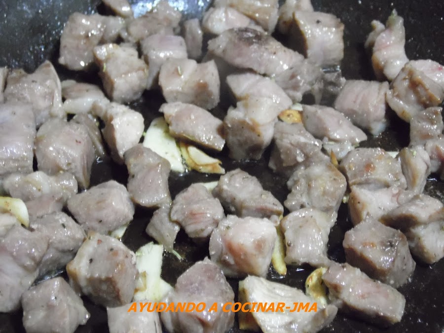 En otro recipiente, dorar a fuego fuerte la carne de cerdo salpimentada junto a unos dientes de ajo cortados en láminas, todo ello con la precaución de remover bastante para que nos se quemen. Lo que pretendemos con esto, es dorar la carne ,que ésta pierda la menos agua posible y que no se cueza en su propio jugo.