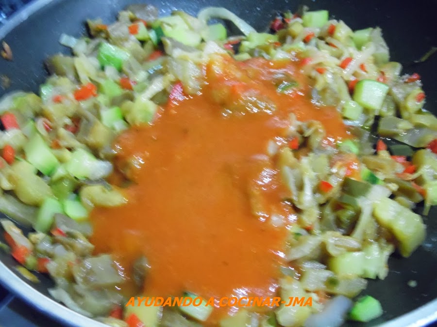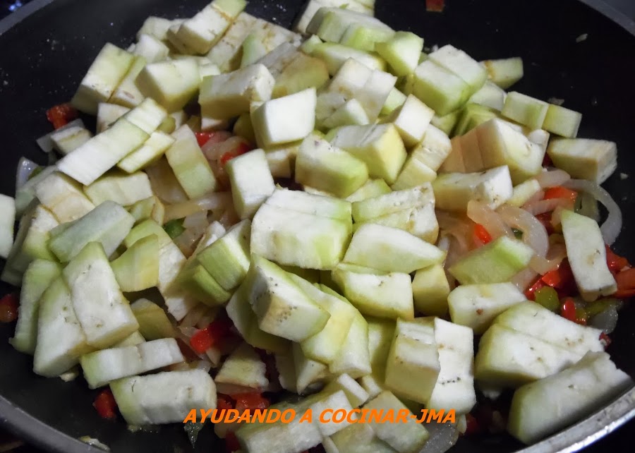 Cuando empiezan a ablandarse la cebolla y los pimientos, es el momento de agregar la berenjena (cortada en cuadrados medianos ) y la dejamos cocinar. Siempre removeremos la mezcla de vez en cuando, evitando de este modo que se nos agarre.