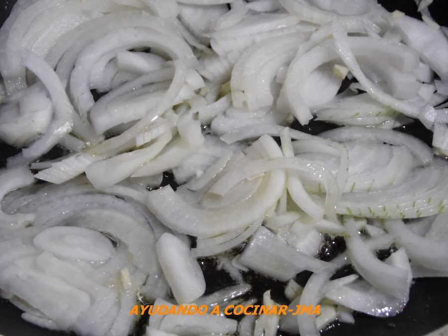 En una sartén con una cucharada se aceite de oliva virgen, ponemos a rehogar la cebolla partida en tiras finas ( Juliana ) junto a los dientes de ajo picados,