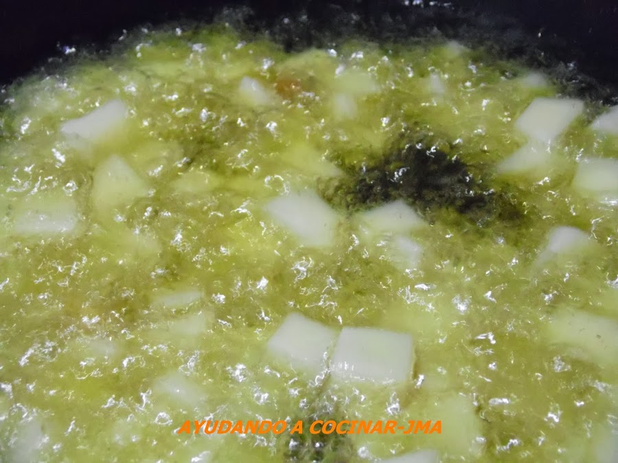 Cuando esten fritas, sacar, poner sobre papel absorbente de cocina y mezclar con las hortalizas ya rehogadas.