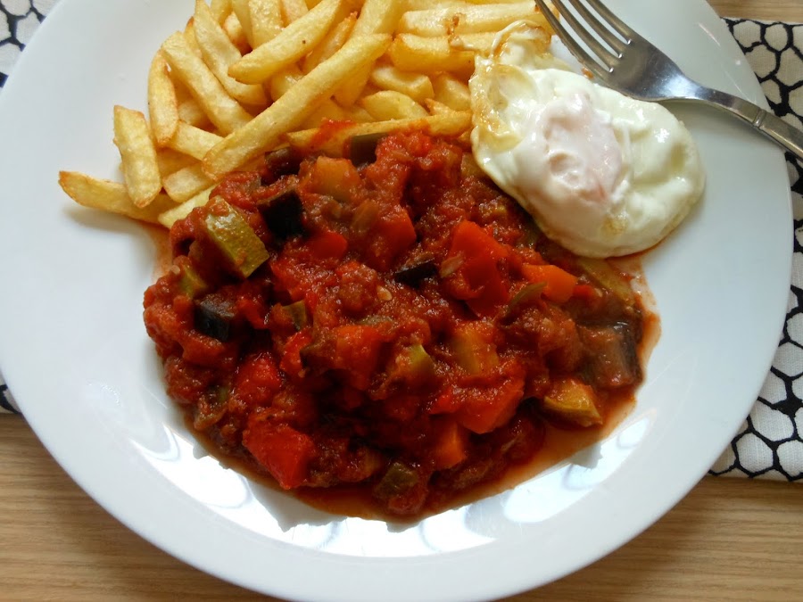 Este pisto lo puedes tomar con unas patatas fritas y un huevo frito como en la fotografía que os muestro.