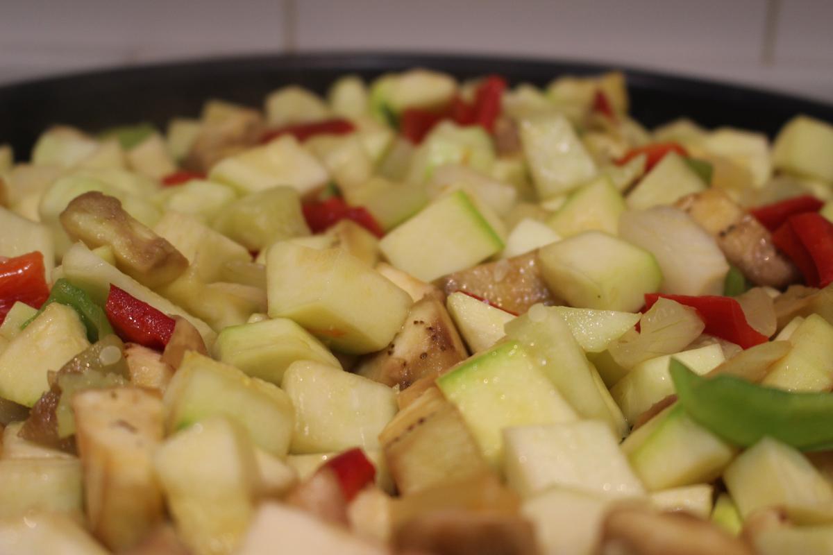 Picar todas las verduras y ponerlas en una sartén grande con un poco de aceite.