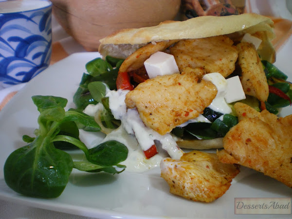 También podemos acompañar nuestra deliciosa pita con pechuga de pollo adobado en una mezcla de especias (pimienta, comino, cilantro, tomillo, mejorana, romero y ajo en polvo) y posteriormente frito a fuego lento.
